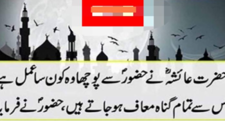 ایک دن رسولؐ نے حضرت عائشہؓ سے فرمایا’’جو جی چاہے مانگو‘‘۔ حضرت عائشہؓ نے عرض کیا ’’وہ راز بتائیے۔ جس سے تمام گ ناہ معاف