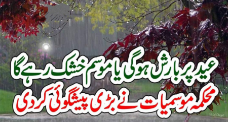 محکمہ موسمیات کا کہنا ہے کہ عید کے موقع پر کراچی میں بارش نہیں ہوگی البتہ بالائی علاقوں اور پنجاب میں بارش کا امکان ہے۔تفصیلات