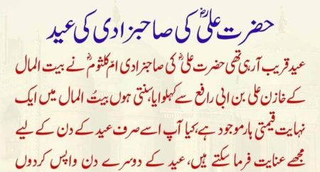 عید قریب آ رہی تھی حضرت علیؓ کی صاحبزادی امّ کلثومؓ نے بیت المال کے خازن علی بن ابی رافع سے کہلوایا۔ سنتی ہوں بیتُ