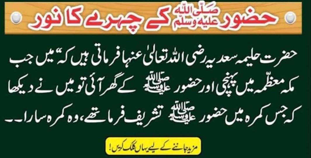 حضرت حلیمہ سعدیہ رضی الله تعالٰی عنہا فرماتی ہیں کہ “میں جب مکہ معظمہ میں پہنچی اور حضور ﷺ کے گھر آئی تو میں نے