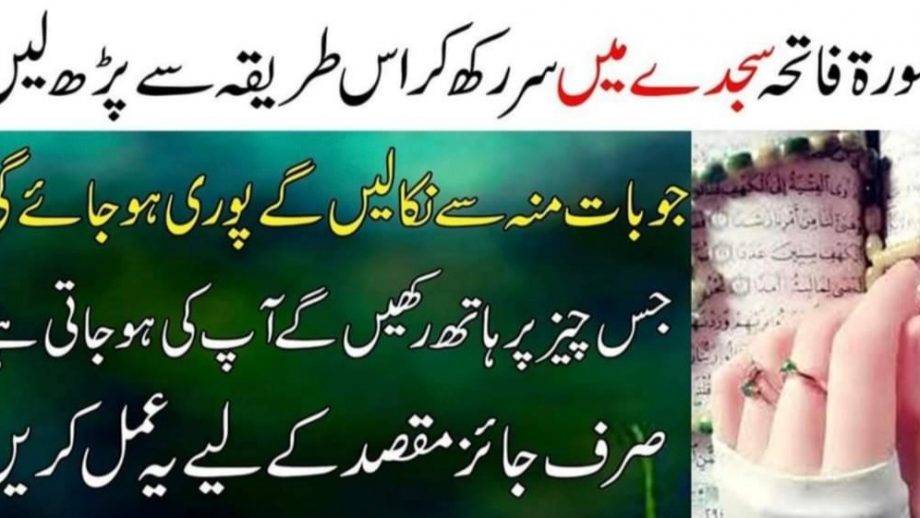 اگر کسی نے جائز مراد مانگنی ہے جو پوری نہ ہوتی ہے تو ہر نماز کے بعد مسجد میں جو عورتیں ہیں وہ گھر میں سورۃ فاتحہ اس طریقہ سے پڑھیں کہ جب ایاک نعبد وایاک نستعین پر پہنچیں تو اکیس مرتبہ ایاک نعبد وایاک نستعین کا تقرار کریں ۔ اس کو پڑھتیں رہیں جب تک 21بار مکمل نہ ہوجائے ۔سورۃ فاتحہ مکمل پڑھ کر سجدے سے سر اٹھا لیں آپ نے سورۃ فاتحہ کو سجدے میں سر رکھ کر پڑھنا ہے ۔پھر اللہ تعالیٰ سے وہ مراد وہ حاجت مانگنی جس کیلئے یہ عمل کررہے ہیں انشاء اللہ اس کی ہر دلی مراد ہر دعا فوراً قبول ہوجائیگی۔
