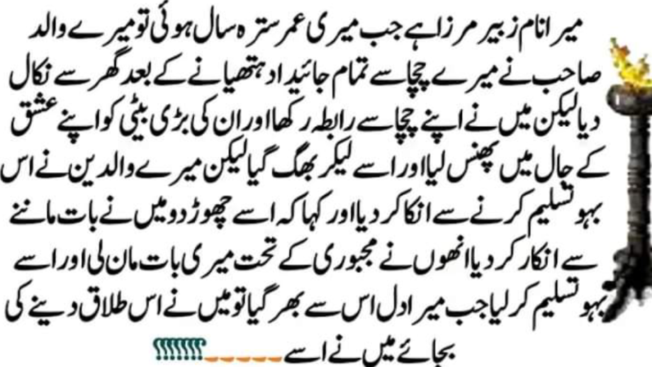 تایا کے نام پر موجود ساری زمین اپنے نام منتقل کر وا لی یہاں تک کہ جس گھر میں وہ مقیم تھا وہ گھر بھی اپنے نام کروا لیا اور پھر پولیس سے ملی بھگت کر کے اسے گھر سے اٹھا باہر کیا اور گھر کا سامان بھی باہر پھینک دیا میری بچی نے لاکھ ہاتھ جوڑے اپنی معصوم بچیوں کو سامنے کر کے کہا ان پر ترس کرو مگر میرے والد صاحب کے دل میں ذرا برابر بھی رحم نہ آیا چچا چونکہ پیسے تعلق تعلیم اور وسائل وغیرہ ہر لحاظ میرے والد سے کمزور تھے اس لیے کچھ دن تک لڑنے اور بد دعائیں