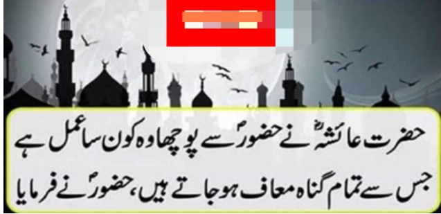 ایک دن رسولؐ نے حضرت عائشہؓ سے فرمایا’’جو جی چاہے مانگو‘‘۔ حضرت عائشہؓ نے عرض کیا ’’وہ راز بتائیے۔ جس سے تمام گ ناہ معاف ہو جائیں‘‘حضورؐ نے فرمایا ۔’’وہ یہ راز ہے کہ جب کوئی مومن کسی دوسرے مومن کی کانٹا چبھنے کے برابر تکلیف دور کرتا ہے۔ تو اللہ اس کے تمام گن اہ معاف کر دیتا ہے۔اور جنت میں اس کواعلیٰ درجہ ملے گا‘۔‘