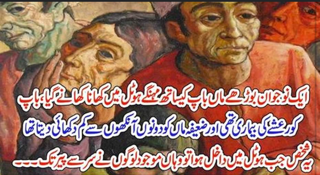 ایک نوجوان اپنے بوڑھے ماں باپ کے ساتھ کسی مہنگے ہوٹل میں کھانا کھانے گیا۔ ماں باپ تو نہیں چاہتے تھے، لیکن بیٹے کی خواہش