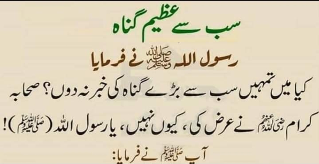 رسول اکرم صلی اللہ علیہ وسلم نے فرمایا کیا میں تمہیں سب سے بڑے گناہ کی خبر نہ دوں؟؟ صحابہ کرام رضی اللہ تعالی عنہ